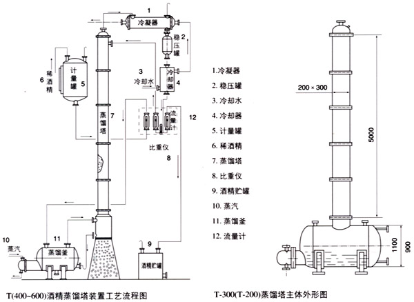 本装置有T-200、T-300、T-400、T-500、T-600共五种规格,每种规格包括相应蒸馏塔、蒸馏釜、冷凝器、冷却器、稳压罐。比重测定器及其它辅助设备用户自备。我厂也可按用户要求另行加工供应。